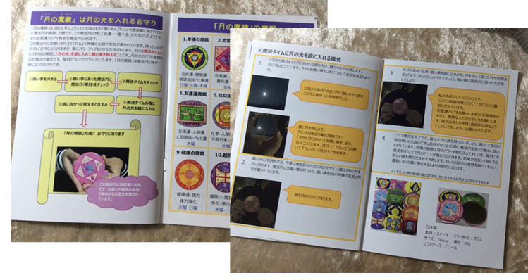 鏡に月を映して願い事を込めるお守りです。約3000年前の「ソロモン王の魔法円」を受け継いだ「黒い雌鶏」。魔法円には願い事をかなうように神様と呪文が書かれています。魔法円は儀式で使用する大切なものです。その大切な魔法円をかわいくデザインしました。もちろん呪文はそのままです。魔法円つきの鏡で月の光を取り込みパワーアップさせましょう。月の光は毎月決まった日・時間に行います。魔法タイムといわれる神様が舞い降りる時間帯に願い事を込めます。